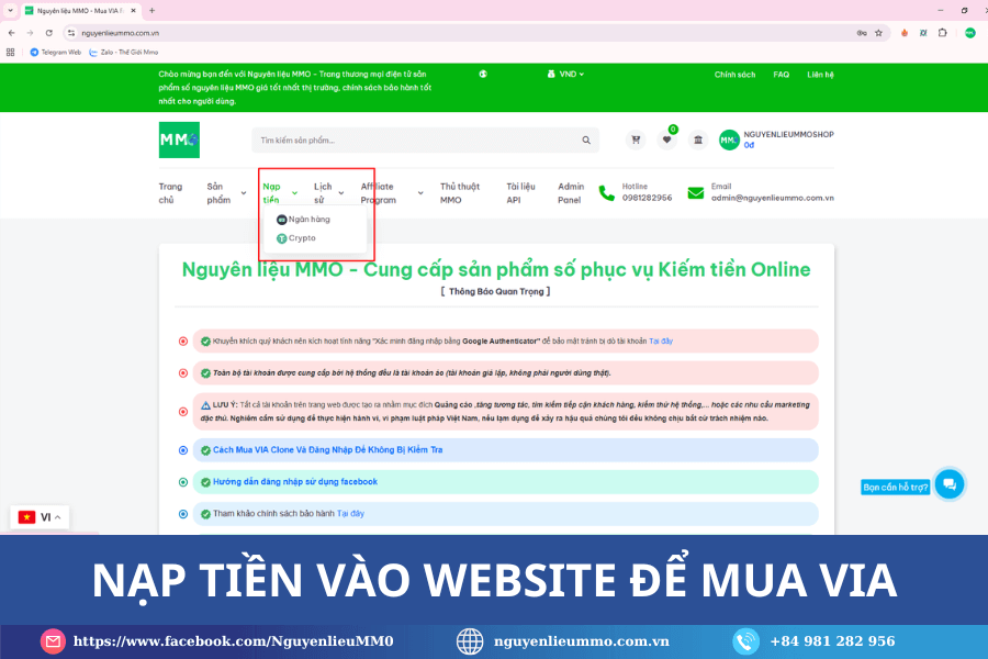 BƯỚC 3: NẠP TIỀN VÀO WEBSITE ĐỂ MUA VIA