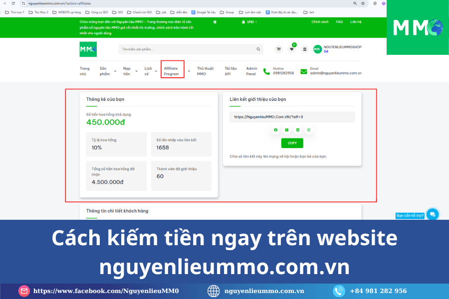 Nhờ đó, bạn có thể vừa mua nguyên liệu MMO giá rẻ, vừa kiếm thêm thu nhập thụ động từ việc chia sẻ link giới thiệu.